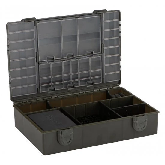 La caja de aparejos se adapta a todas las nuevas cajas de compartimentos internos estándar y XL, cajas de compartimentos ajustables, cajas de anzuelos y los ingeniosos soportes de guía en tamaños estándar y XL. La caja viene con 3 divisores largos, 2 cortos y 1 mediano. Estos son extraíbles y se pueden usar para organizar la caja de aparejos como mejor le parezca. La distribución de las muescas para los divisores ha sido cuidadosamente pensada para que el espacio se pueda aprovechar de la manera más eficiente posible. Como resultado, las cajas de compartimentos no se deslizarán a través de la caja y todos los aparejos finales se almacenarán de manera efectiva. Desde herramientas de aparejo y carretes de material hooklink hasta material de guía; Todo encaja perfectamente en esta caja de aparejos.