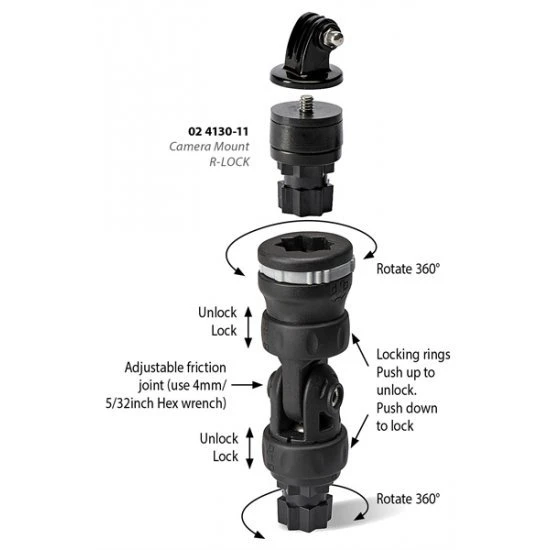 Monte y retire una GoPro o una cámara de acción rápida y fácilmente en este práctico soporte RAILBLAZA en un kayak, bote, yate, bicicleta, riel o casi cualquier otra superficie. Este soporte para cámara tiene la rosca de ¼ de 20 pulgadas universalmente aceptada y un adaptador de trípode GoPro, lo que lo hace compatible con la mayoría de las cámaras del mercado. Giratorio e inclinable. Adaptador de cámara extraíble para una colocación compacta en una base StarPort.