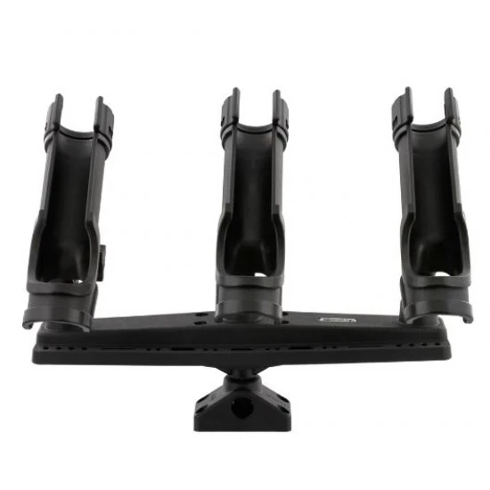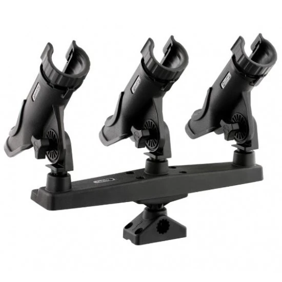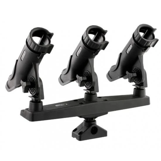 El Triple Rod Holder viene con tres Power Locks. El soporte universal puede contener casi cualquier configuración de cañas y carretes y tiene un anillo de bloqueo en la parte delantera para evitar la pérdida de la caña durante el viaje. Incluye una combinación de montaje lateral/de cubierta que se acopla directamente al montaje triple y gira 360 grados. Triple Mount viene completo con una herramienta práctica y un soporte para señuelos para mantener las cosas organizadas. Cada soporte de barra Power Lock puede girar 360 grados e inclinarse hacia arriba o hacia abajo individualmente para una máxima versatilidad. Diseñado como portacañas multiusos para una amplia gama de especies de peces grandes/medianas o pequeñas y prácticamente cualquier embarcación.